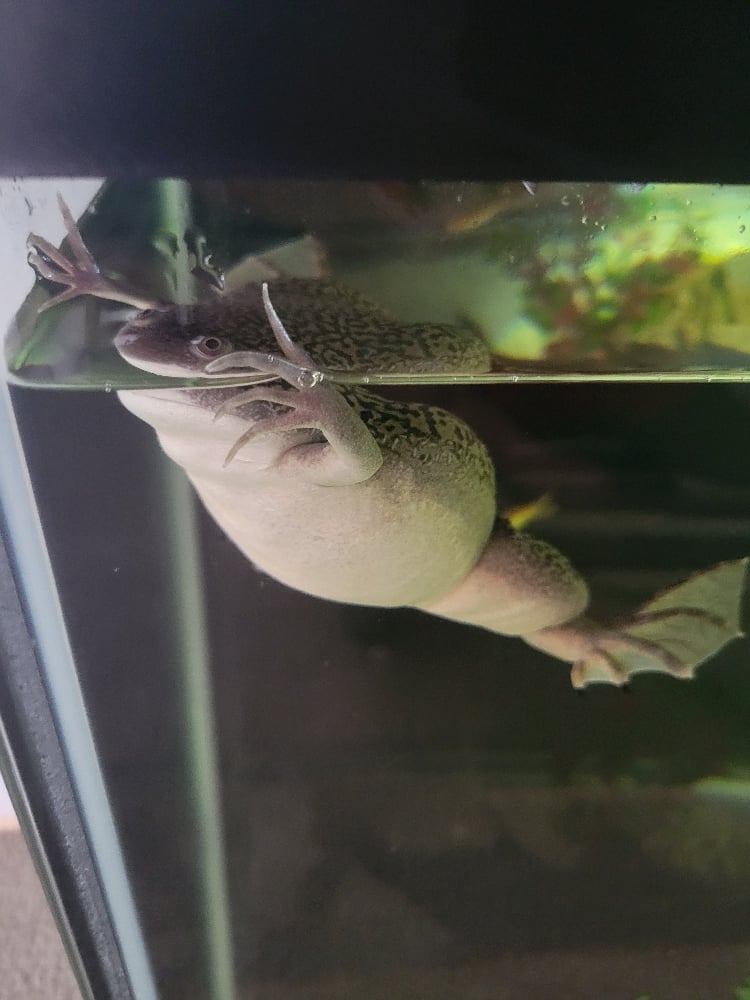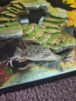 Breeding pair of African Clawed Frogs. One male & one female. Recently dropped off for rehoming. They eat live worms and MUST be kep in a fully aquatic aquarium with a lid.