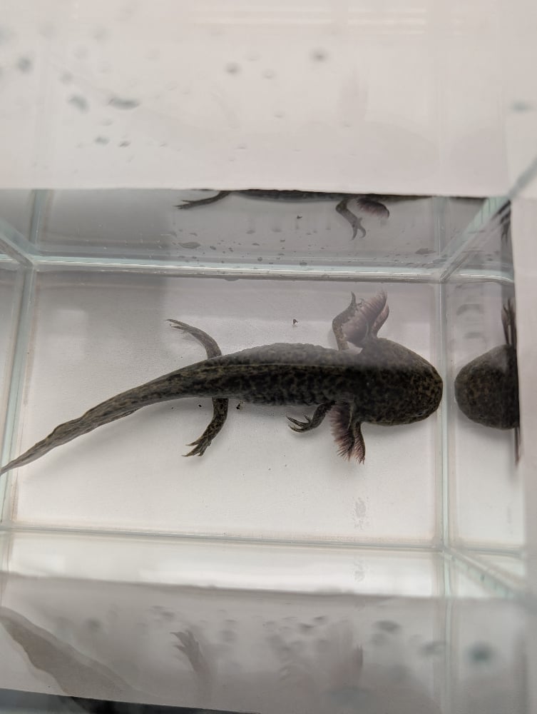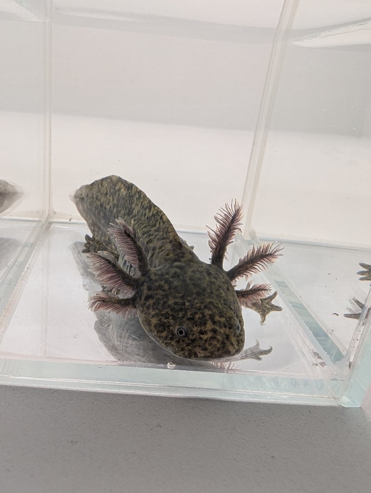 The wild type axolotls tend to be a dark greyish green with black and olive mottling. They can have speckles of gold (iridophores) and a pale colored belly. These specimens are special because they have the same pattern and colors as those found in the wild.